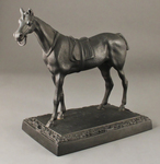 На прямоугольной подставке изображена лошадь с подрезанным хвостом. На лошади есть седло и поводья. Скульптура выполнена в стиле минимализма и лишена каких-либо необычных элементов. Окантовка подставки, на которой стоит лошадь, отчеканена и имеет орнамент.