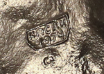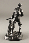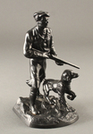 На подставке с неровной поверхностью изображён мужчина с портфелем на спине. В руках он держит ружьё, отведя его в сторону. Рядом с ним стоит небольшая собака с приподнятой лапой. По позе охотника можно определить, что он полон решимости.
