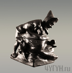 Изображена фигура гнома на большом, сказочном пне. Фигура сосредоточена на подставке, и подставка включена в скульптурный ансамбль. Верхняя часть пня, вместе с гномом, является крышкой шкатулки и открывается. Обилие сглаженных элементов на шкатулке и отсутствие лишних делает шкатулку очень красивой и слаженной.