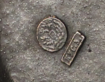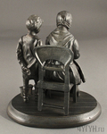На большой овальной подставке изображены фигуры пожилой женщины и мальчика. Женщина изображена на аккуратно выполненном стуле и занята вышиванием, а мальчик изображён позади и наблюдает за её занятием. На поверхности подставки заметны ровные тонкие линии, созданные для имитации деревянного пола. Фигуры женщины и мальчика отчеканены гораздо сильнее, чем мебель, что делает их более заметными.