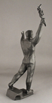 Изображена фигура Гагарина в космическом скафандре, спускающегося с двухуровневой подставки как со ступенек. Статуэтка лишена деталей и чеканки, и имеет угловатый вид.