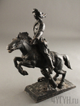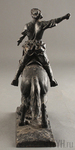 Изображена скульптура из фигур коня и восседающего на нём верхом мужчины. Конь находится в движении, передние его ноги приподняты. Мужчина отводит руку в сторону, устремлённо смотря вдаль. Скульптура имеет очень агрессивный, энергичный посыл благодаря приданию автором некоторым деталям эффекта развевания на ветру. Под конём также находится пушка, сливающаяся с ним в одно целое.
