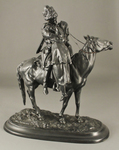 Изображена трогательная сцена прощания казака с женой перед его отъездом на службу: казак в папахе, с ружьём в чехле за спиной, сидящий на коне, обнимает казачку, привставшую к стремени. Скульптура наделена многочисленными деталями в виде складок; мелкой чеканки папахи казака, шерсти лошади, поверхности подставки.