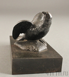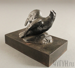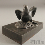 На высокой, симметричной, и плотной подставке изображена небольшая фигура птицы, расправившей свои крылья. Она поворачивает голову и смотрит вдаль. Птица изображена на небольшом уплотнении на подставке, имитирующем почву. Отдельного внимания заслуживает мелко отчеканенное оперение птицы, а также её лапы, имеющие мелкую резьбу.