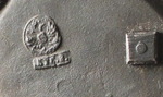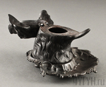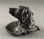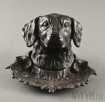 На фигурной подставке в виде лотка изображена одинарная чернильница в виде головы собаки. Чернильница открывается в области шеи собаки, открывая резервуар для чернил. Изделие выполнено с максимальной детализацией: узорчато отчеканена шерсть собаки, чувственно переданы глаза; на подставке также присутствует абстрактный узор.