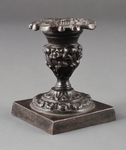 Изображён низкий, на круглом основании, подсвечник в виде вазы, покрытой рельефным сложным цветочным орнаментом, украшающим верхнюю часть, ножку и часть самого подсвечника.