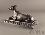 Изображена фигура прилёгшей собаки на подставке. Подставка состоит из двух уровней, есть окантовка в виде узора. Собака смотрит вперёд, перекрестив свои лапы. Отчеканенные полосы на боках собаки подчёркивают её худощавое телосложение.