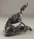 Изображена фигура собаки с приподнятой кверху мордой, под ней лежит заяц. Изделие богато детализацией: тело собаки имеет обтекаемую, гладкую поверхность, подчёркнуты её кости. Тело зайца отчеканено.
