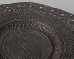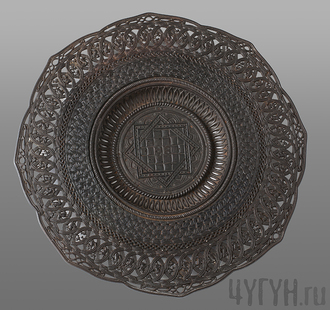 Изображено неглубокое симметричное блюдо с витиеватыми краями. Блюдо полностью украшено узорами и имеет в центре также симметричный геометрический символ.