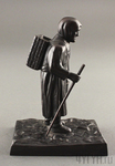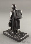 Изображена пожилая женщина с посохом на большой прямоугольной подставке. На ней длинная юбка ниже колена и куртка, на голове — платок. На спине у неё большой короб, имеющий узор в виде решётки. Скульптура снабжена многочисленными вертикальными линиями, полученными с помощью чеканки. Данный эффект зримо "опускает" фигуры женщины.