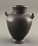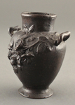 Изображена широкая ваза с узким горлышком и небольшими ручками. На ней отчеканен узор из цветов. За счёт гладкой поверхности вазы цветы выглядят смотрятся очень живописно.