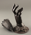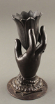 Ваза в виде раскрытого цветка тюльпана в кисти дамской руки. Запястье плотно охвачено манжетой рукава и украшено двойной ниткой бус. Основание круглое, плоское.