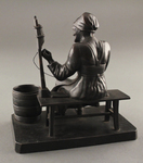 На ровной, прямоугольной подставке изображена сложная композиция: прядущая женщина, бочка и лавка с веретеном. Женщина держит тонкую, изогнутую нить: с точки зрения литья такие элементы получить довольно сложно. Бочка служит вместилищем для спичек.