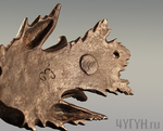 Изображён зажим для бумаги в виде головы ерша. Рот ерша является зажимом. Чешуя у этой фигуры мелко и отчётливо отчеканена. Сама фигура может стоять, так как устроена на подставке в виде листа.