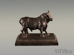 Изображена фигура спокойно стоящего быка на прямоугольной подставке. Подставка имеет ровную, сглаженную поверхность, в то время как фигура быка имеет рельеф.