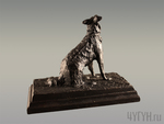 Изображена фигура присевшей собаки на подставке. Взор собаки устремлён вдаль. Поверхность фигуры сильно отчеканена для воссоздания шерсти, в то время как подставка имеет ровную форму. За счёт приёма контраста внимание концентрируется на собаке как ключевом элементе композиции.