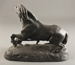 На объемной подставке изображена лошадь. Она смотрит на небольшого щенка, который находится справа от неё. Фигура очень грациозна благодаря гладкой, отшлифованной поверхности тела лошади. Эффектности также добавляет наклон лошади в сторону.
