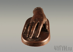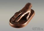 Пресс-папье изображено на плотной подставке в виде изящной женской руки. На запястье красуется небольшое украшение. Рука имеет обтекаемую, гладкую форму.