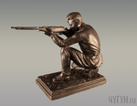 На прямоугольной подставке изображена фигура солдата, прицеливающегося из ружья вдаль. Он носит солдатскую униформу; прицеливается, оперевшись локтём на своё колено. Униформа солдата имеет очень реалистичный вид за счёт присутствия специально отлитых складок.