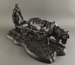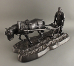 Изображена фигура мужчины в крестьянской одежде, идущий за плугом, в который запряжена лошадь. Подставка низкая, с рельефом вспаханной земли на поверхности.