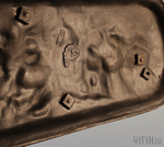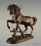 Изображена фигура лошади с приподнятой передней ногой, будто брыкающейся. Рядом с лошадью изображена небольшая покосившаяся ограда. Скульптура выполнена на продолговатой узкой подставке. На фигуре лошади имеются тонкие, еле заметные очертания её мускулатуры – результат чеканки.