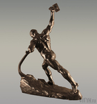 Изображена фигура обнаженного рабочего в рост, опирающегося на полусогнутый меч, с молотом в поднятой вверх руке. Фигура выполнена на подставке, часть которой плоская, а другая возвышается. У скульптуры очень сильный посыл, который выражается через динамичную, полную решимости позу рабочего. Скульптура сильно отчеканена. Чеканка показывает мускулатуру рабочего.