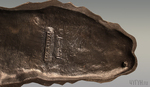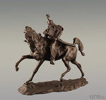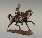 Скульптура выполнена на узкой продолговатой подставке. На ней изображена фигура лошади в движении, а на лошади – мужчины в плотном одеянии. Скульптура изображена в движении.