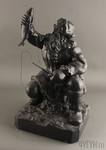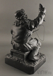 Изображена фигура зрелого мужчины на неровной, толстой подставке. Мужчина одет очень тепло: на нём шапка-ушанка, пальто и валенки. Он сидит на припорошенной снегом коробке и, высоко подняв свою руку, держит в ней свежевыловленную рыбу.
