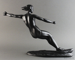 На подставке в виде водной глади изображена фигура девушки на водных лыжах. Она будто застыла в движении: корпус её отведён назад, а рука держит трос, которого нет в составе скульптуры.