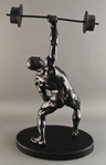 На овальной профилированной подставке - фигура обнаженного атлета с короткой стрижкой. Его ноги полусогнуты в коленях, в правой, поднятой вверх руке он держит штангу. С помощью чеканки и игры света переданы мускулы атлета. Благодаря особенностям позы атлета мастерски передана его сила.