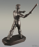 На восьмиугольной, невысокой подставке изображена фигура молодого человека, одетого в спортивный костюм. Корпус его отведён назад, в руке он держит палку и ею замахивается. Одежда и полная готовности поза спортсмена свидетельствуют о важности и своеобразности игры в "городки", популярность которой значительно спала с развалом СССР.