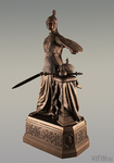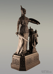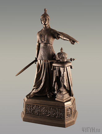 «Россия» – это аллегория Российского государства в образе женщины-воительницы в древнерусских доспехах. В правой руке она держит меч, левая рука со щитом простерта над атрибутами самодержавия – царским венцом, скипетром и державой, лежащими на высокой задрапированной тумбе.