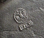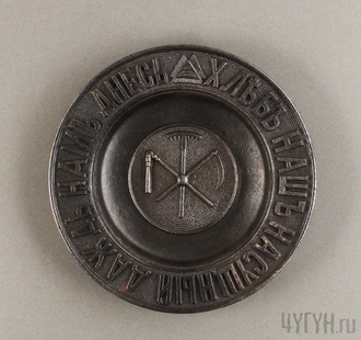 Дно данного блюда украшено гербом в виде молота, перекрещивающегося с двумя косами. На краю блюда отчеканен слоган.