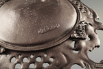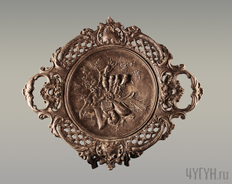 Сухарница в виде тарелки с двумя фигурными ручками, борт - ажурная плетёнка, декорированная раковинами. На зеркале - рельефное изображение ветки дерева с сидящими на ней птицами, а под ними расположены разнообразные музыкальные инструменты.