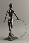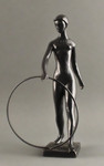 На прямоугольной подставке изображена девушка, придерживающая одной рукой обруч. Примечательно, что фигура девушки практически лишена деталей. Вместо неё внимание к себе приковывает тончайший и очень элегантный обруч.