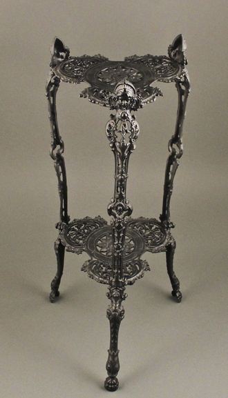 Три изящно изогнутых ажурных ножки поддерживают две полочки, напоминающие трехлепестковую розетку. Ажур состоит из стилизованных цветов и листьев. Характерный акцент для композиции этой этажерки - женские маски, которыми завершаются ножки этажерки.