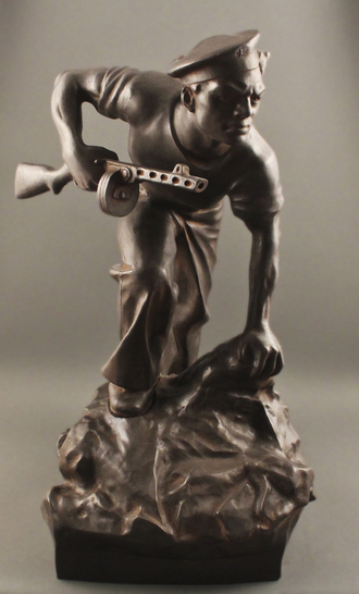 Изображена фигура мужчины-моряка в решительной позе, на неровной подставке в виде камня. За счёт позы и уверенного выражения лица мужчины скульптура приобретает дух бодрости.