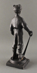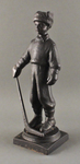 На объемной подставке изображён мальчик, одетый в тёплую одежду. В руке он держит хоккейную клюшку, поставив её на пол. Одежда хоккеиста имеет отчеканенный геометрический рисунок.