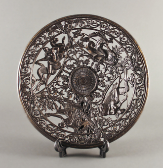 Настенная круглая ажурная тарелка, дно которой декорировано многолепестковой розеткой, по борту расположены четыре овальных медальона с изображением Нептуна и речных божеств.