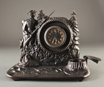 Изображена сложная скульптура в виде часов и чернильницы. Стенд с часами стилизирован под скалу в лесу, вокруг которой растут деревья, и рядом стоит пограничник. Вокруг часов имеется симметричное углубление, благодаря чему циферблат очень выдаётся на фоне всей скульптуры. Чернильница представлена в виде пня с откидывающейся крышкой у стенда с часами.