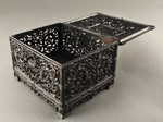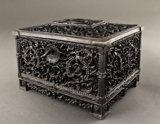 Изображена симметричная шкатулка с откидывающейся крышкой сверху. Всё покрытие шкатулки украшено многочисленными символами с перекрещенными серпом и молотом.