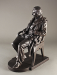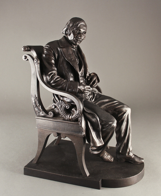 Скульптура изображает Гоголя в кресле с узорчатыми ручками (на ровной подставке). Костюм писателя отчеканен с целью изобразить складки и блики. Данная скульптура -- уменьшенная версия проекта памятника, который должен был быть построен в Москве, но идея была отклонена.