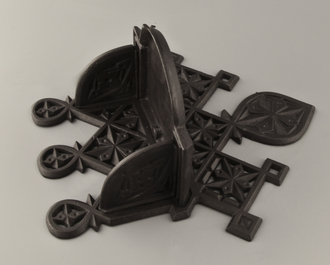 Изображён кронштейн с угловатым орнаментом, который прикрепляется к стене и служит опорой для полки.