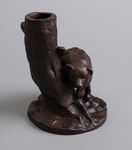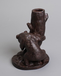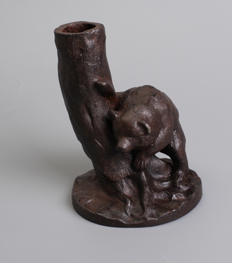 Изображена подставка для карандашей в виде обрубленного полого дерева. Фигуру дополняет медведь, заглядывающий за дерево. Поверхность изделия мелко отчеканена.