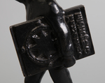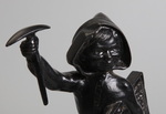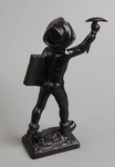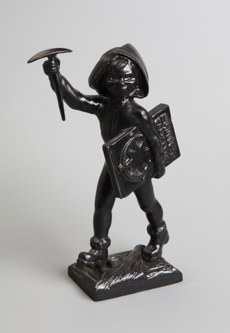 Изображена статуэтка маленького мальчика в костюме с капюшоном на небольшой подставке. В одной руке он держит кирку, а в другой -- сжимает книгу с изображением компаса и словами "Юный следопыт".