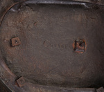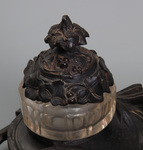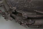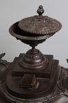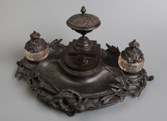 Изображена многоуровневая чернильница довольно сложной формы. На вершине изделия находится резервуар для чернил с открывающейся крышкой (в виде небольшой чаши). По обе стороны изделия также располагаются резервуары, но из стекла, с большими крышками, украшенными листьями. Для всего изделия справедлив природный мотив: у основания находится ванночка для чернил, окантованная чугунными лозами.