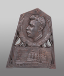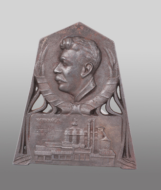 Представлен барельеф с изображением Кусинского завода в нижней части плакетки. На самом барельефе изображён бюст Сталина Иосифа Виссарионовича (1878 - 1953) - советского политического, партийного, военного и государственного деятеля. За время его правления произошло много важнейших событий для истории СССР, как положительных, так и отрицательных: индустриализация страны, коллективизация сельского хозяйства, установление диктаторского тоталитарного режима, Вторая Мировая война, начало холодной войны и другие.