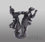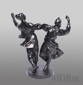 На симметричной небольшой платформе изображены фигуры юноши и девушки в танцы. Они держатся за руки, отклоняясь в стороны, добавляя динамики в скульптуру.