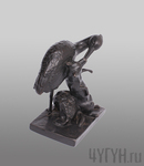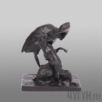 На небольшой неровной платформе изображены фигуры лисицы и журавля. Журавль стоит, наклонившись, и клюв его находится в пасти у лисицы, которая, в свою очередь, стоит на задних лапах.