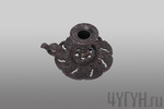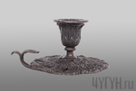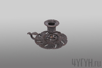 Изображён невысокий подсвечник посередине круглой подставки, украшенной симметричным орнаментом из листвы. Из одной стороны подставки вылезает небольшое дополнение в виде отростка, растущего вверх.